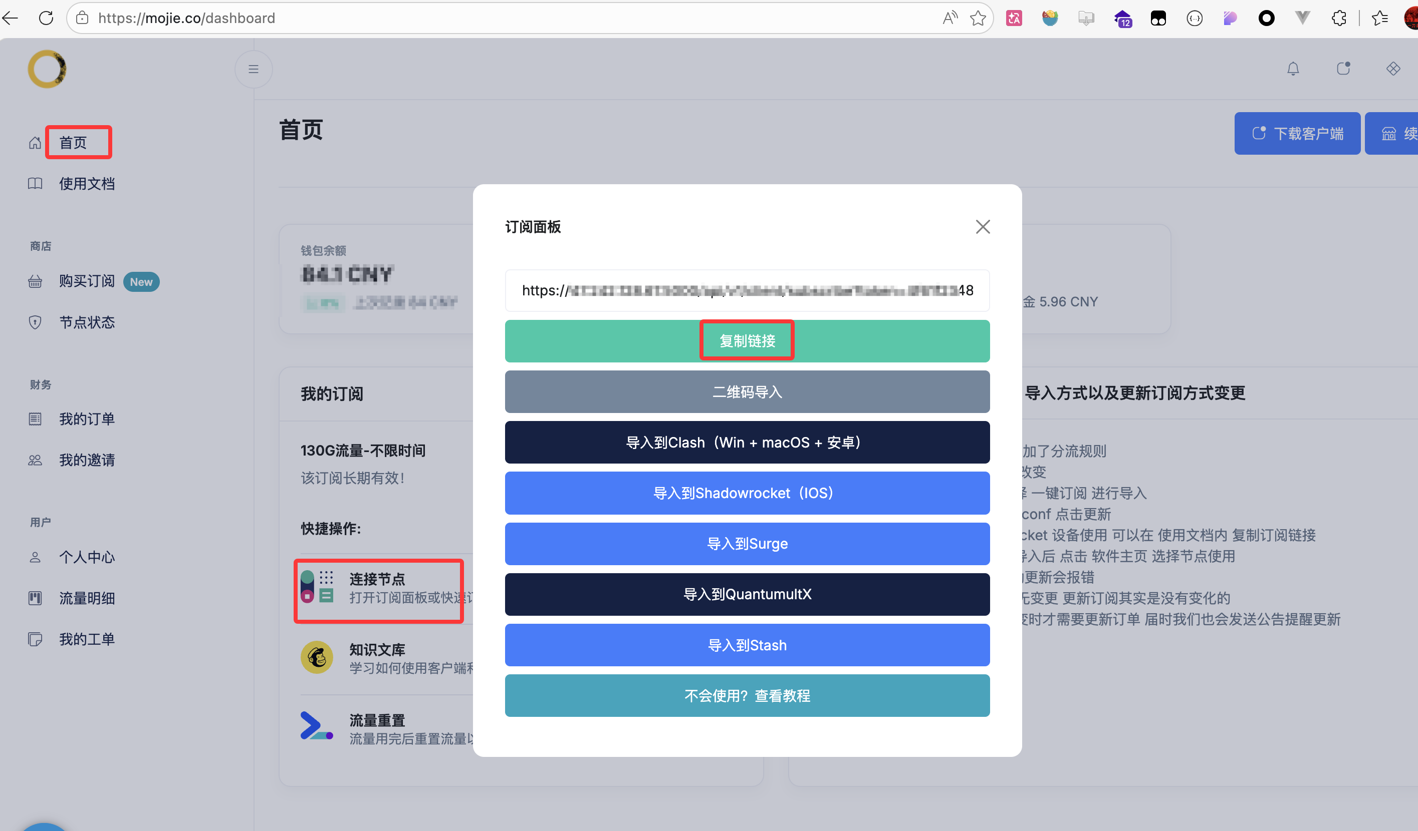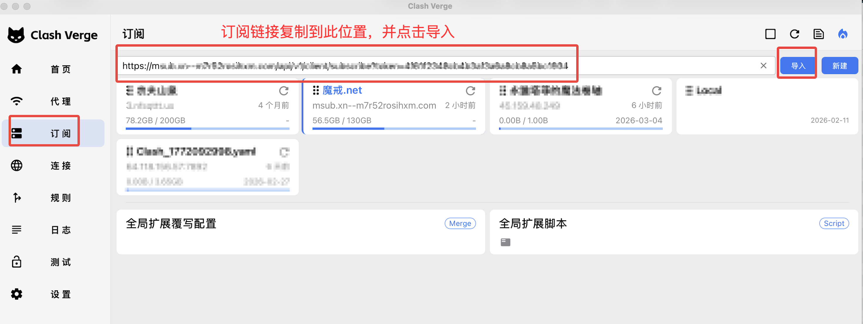 参照上一节步骤购买节点后,会获得一个订阅地址,复制到C*l*a*s*h的订阅地址栏,点击“导入”