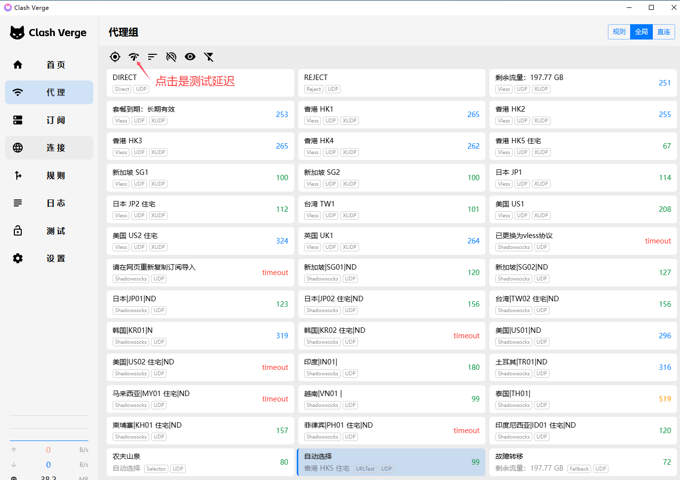 根据检测结果选择,红色timeout的节点表示暂时无法使用,绿色的数字代表可用的节点,理论上延迟越低越好用,但需要根据实际情况和使用需求决定,延迟和速度无关。