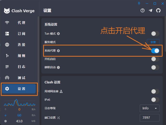 开启代理的方式很简单,点击设置-开启系统代理开关即可